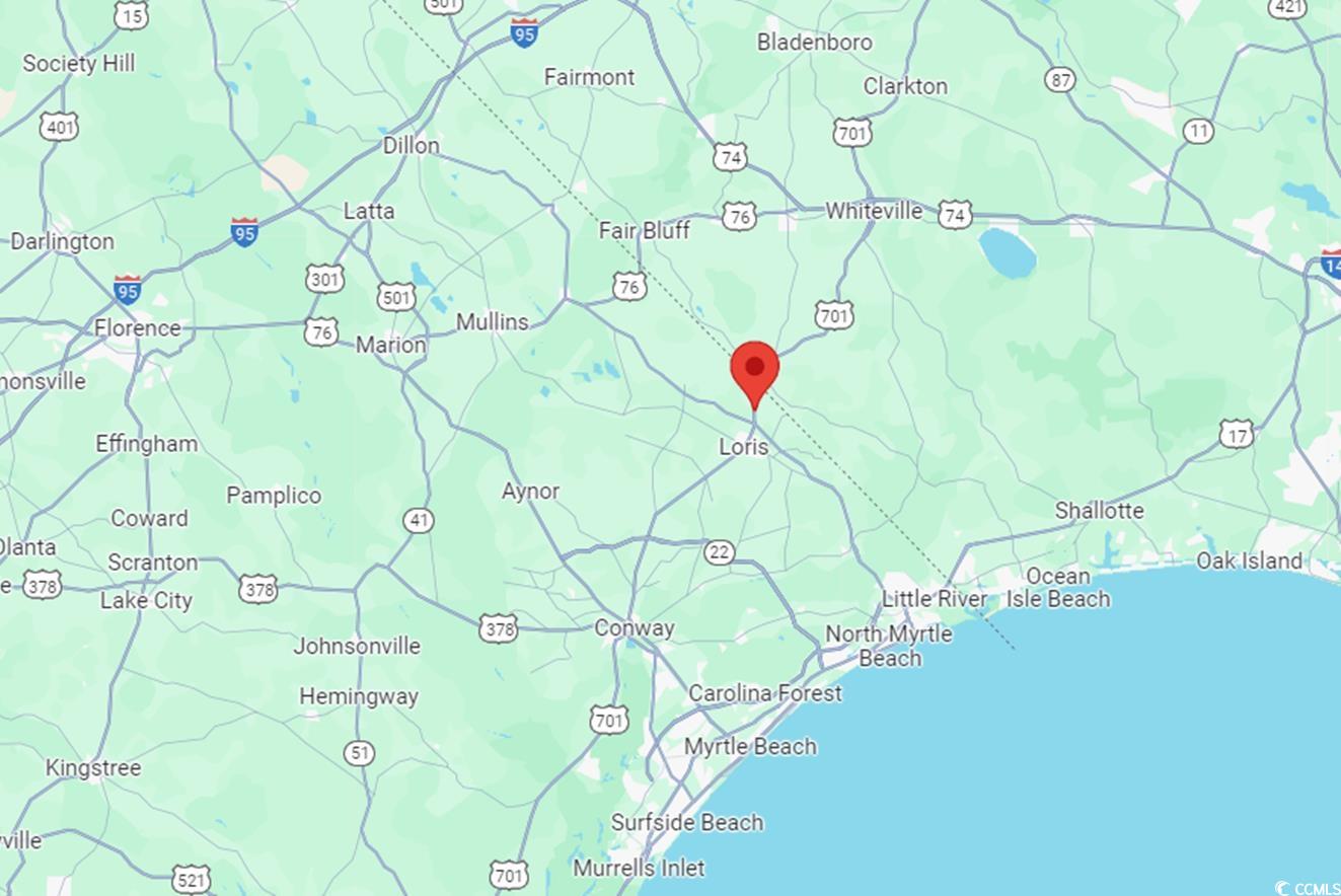 LORIS, SC- Approximately 40.83 acres of vacant land on HWY 701... (1,095 feet of frontage) just north of HWY 9 in Loris. Zoned "TRS" for Transportation-Related Services district. There are many permitted uses, some of which are Convenience stores with gasoline, Grocery stores, New and used auto and boat sales, hotel/motels, equipment leasing, etc. Call me for a list (in Assoc. Docs)...OR rezone it for a Residential subdivision (in back) with Retail and Grocery at the street!... Water and Sewer are at the street to tap into. SCDOT daily traffic count (2024) was 14,300 vehicles per day...Located in Flood Zone "X" for minimal risk. If you are going from Charlotte, NC to North Myrtle Beach, SC, you're going to drive by this property! Traffic counts are increasing every year. Lock in your price today before they increase! Seller Financing considered to qualified buyers.
